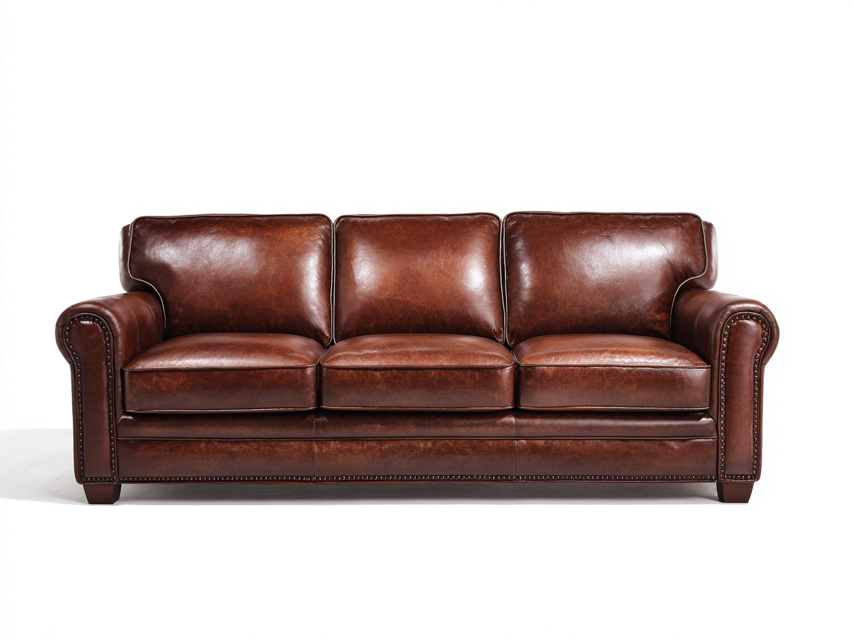 Revêtement en cuir de couleur marron avec finition lisse. Structure interne solide assurant une bonne stabilité. Coutures visibles et détails décoratifs sur les accoudoirs renforcent la qualité de fabrication.