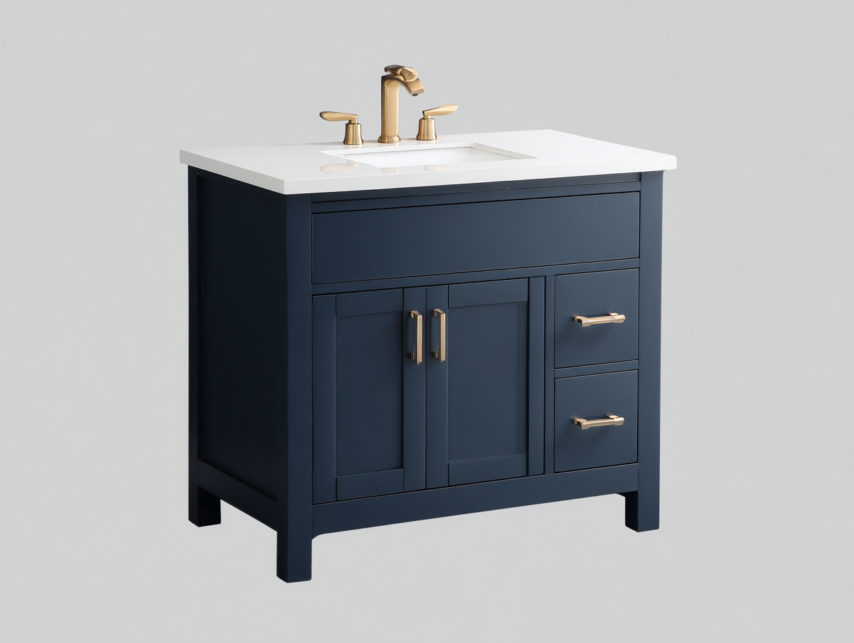 Compartiment avec portes permettant un rangement discret, tiroirs intégrés offrant un espace supplémentaire, surface supérieure avec vasque facilitant l’utilisation quotidienne. Conception adaptée à un usage intérieur dans la salle de bain.